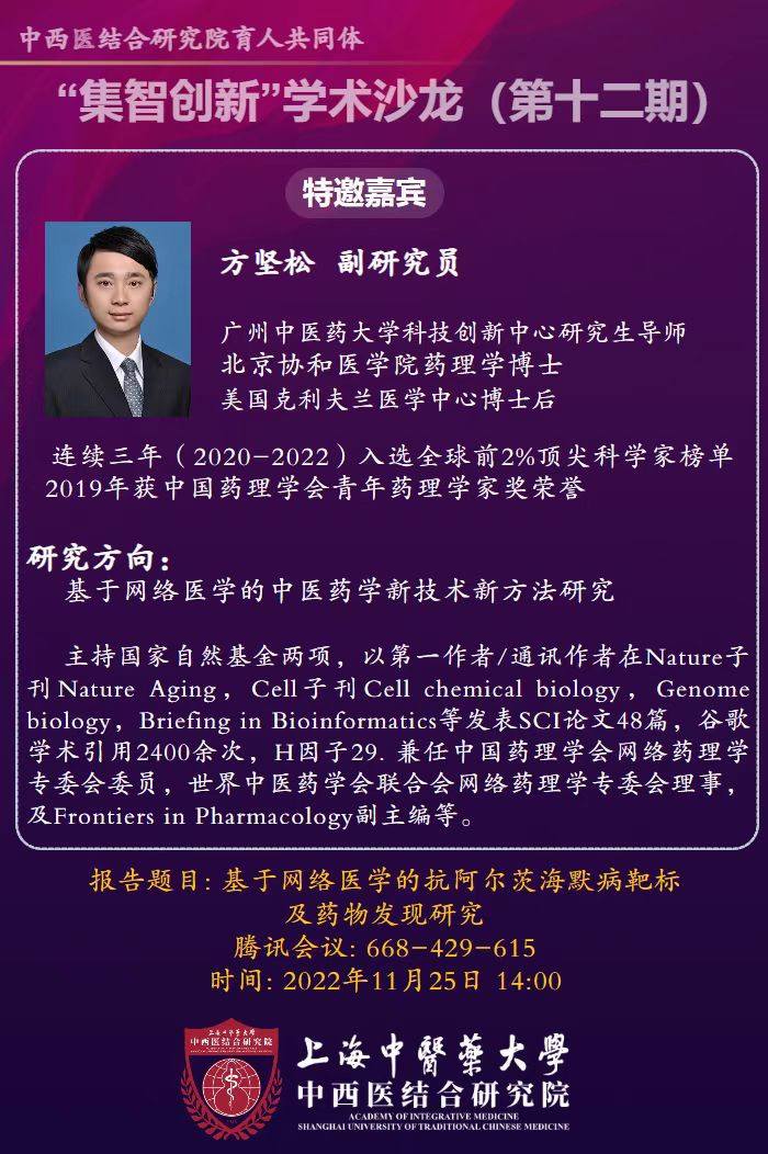 中西医结合研究院第十二期“集智创新”学术沙龙预告