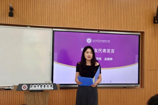 孟婉婷作为校友代表发言,深情回顾了自己在学校求学历程,感恩母校的培养。她期待和各位校友利用学院校友会的平台优势,续写友谊的新篇章,为母校的建设和中西医结合事业的传承贡献力量,