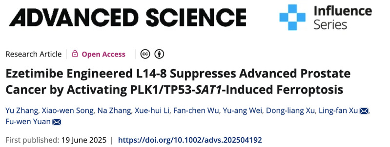 近日,01直播足球 袁富文研究员团队联合交叉科学研究院张宇、安徽医科大学第一附属医院徐凌凡在Advanced Science发表题为“Ezetimibe Engineered L14-8 Suppresses Advanced Prostate Cancer by Activating PLK1/TP53-SAT1-Induced Ferroptosis”的研究成果。该研究基于降脂药依折麦布(Ezetimibe)开发出一种可高效抑制耐药性前列腺癌的新型小分子化合物L14-8。该药物通过激活铁死亡(ferroptosis)通路杀死癌细胞,且在动物实验中未显示明显毒性,为晚期前列腺癌患者提供了独立于雄激素受体(AR)信号通路的新治疗策略。