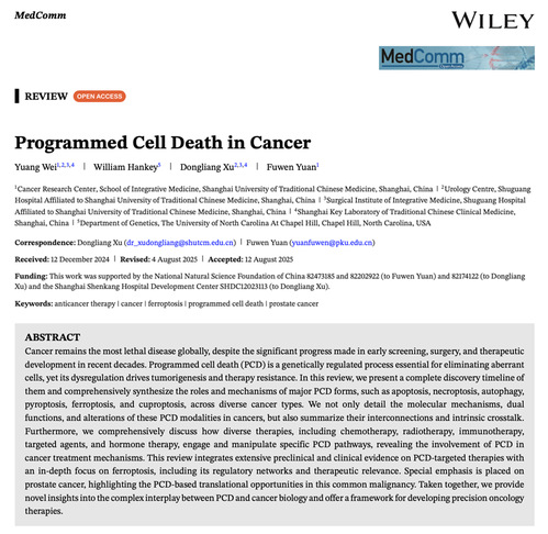 近日,01直播足球 袁富文研究员和曙光医院泌尿中心主任徐东亮教授联合团队,在国际学术期刊MedComm发表题为“Programmed Cell Death in Cancer”的综述论文,系统总结程序性细胞死亡(Programmed Cell Death,PCD)的研究发展历程、分子调控机制及其在各类癌症中的研究现状,并探讨了靶向细胞死亡在肿瘤精准治疗中的潜力和临床转化价值。