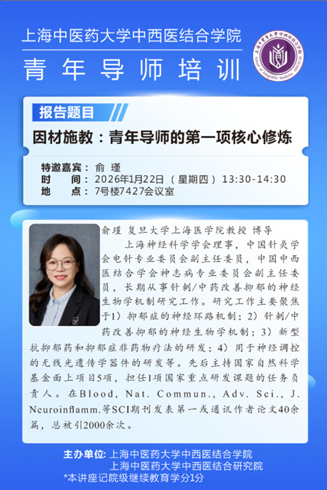作为中西医结合一级博士学位点导师培训系列讲座之一,2026年1月22日特邀复旦大学上海医学院俞瑾教授,以“因材施教:青年导师的第一项核心修炼”为主题,分享了青年导师在科研人才培养中的核心修炼路径,为高等教育与导师发展提供了重要启示。讲座聚焦师生共同成长,从“辩材”“施教”“共生”三个维度层层展开,系统解析了因材施教在研究生培养中的实践策略与理念内涵。