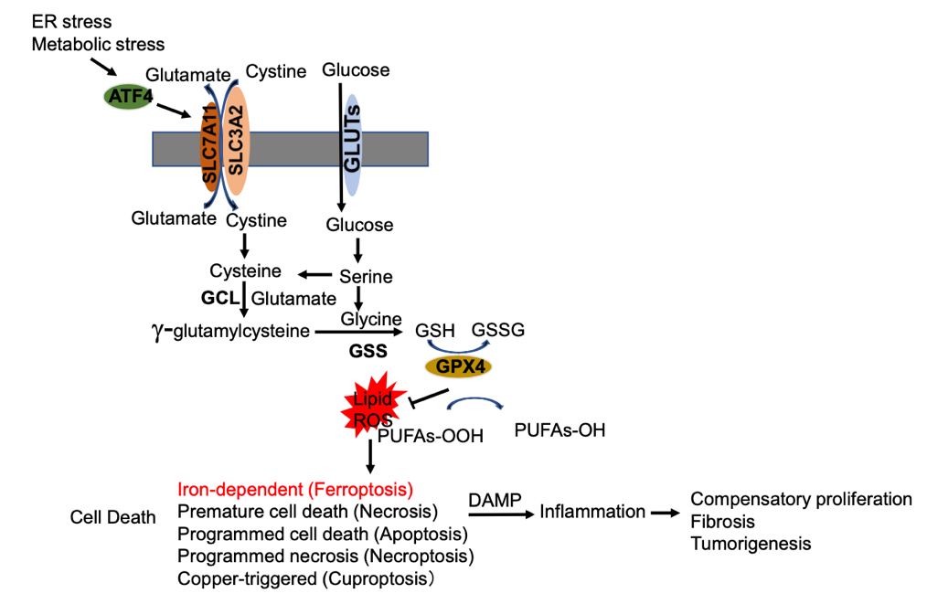 肝细胞癌(HCC)是原发性肝癌的主要类型和肝癌死亡的主要原因,与病毒性肝炎、非酒精性和酒精性脂肪性肝炎(NASH、ASH)相关,所有这些都会引发细胞应激、肝细胞死亡、炎症和代偿性增殖。内质网应激/整合应激反应下游转录因子ATF4是调节应激反应的重要蛋白,其在健康肝细胞中表达水平较低,但在癌症中高表达。ATF4在决定肝细胞死亡、肝损伤以及肝癌发生中起重要作用。不同于癌细胞中ATF4高表达通过赋予细胞的生长优势增加癌细胞的恶性以及癌症治疗中的抗药性,研究组运用基因敲除和转基因小鼠建立NASH和HCC模型,结合组织病理学和细胞生物学以及转录组测序分析等方法研究发现在正常肝细胞中虽然ATF4基因敲除可以降低肝脏脂肪的聚集程度,但是却增加肝细胞铁死亡敏感性和增强肝脏炎症反应,因而促进肝脏代偿性增殖和肝癌的发生。应激反应诱导ATF4表达上调,高表达的ATF4诱导SLC7A11表达。SLC7A11是编码胱氨酸-谷氨酸反转运蛋白的一个亚基,是谷胱甘肽(GSH)合成所必需的,并且调控铁死亡。课题组研究发现ATF4和氧化应激转录因子NRF2协同调节铁死亡关键蛋白SLC7A11/xCT的表达,并抑制铁死亡的发生。ATF4通过调控细胞避免过多发生铁死亡保护损伤的肝细胞,从而降低炎症的发生以及肝癌炎性转化。由于细胞死亡方式有多种,该研究也阐明了铁死亡作为可以诱发肝炎的重要死亡方式促进肝炎和肝癌的发生和进展。除了在非酒精性脂肪肝炎中的保护作用,ATF4在药物性肝损伤以及药物毒物引起的肝癌发生中有相似作用。该研究为肝癌防治提出了新的思路,与肝癌相关的应激反应关键蛋白ATF4实际上可能是预防肝癌的关键点,为发挥传统中医药防治肝炎肝癌的应激反应和稳态平衡的优势提供理论基础。
