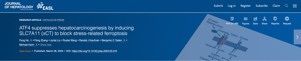 近日,01直播足球 研究院何锋研究员团队联合美国礼来制药公司和美国加州大学圣地亚哥分校研究团队在欧洲肝病研究学会期刊《Journal of Hepatology》(IF=30.083)在线发表题为“ATF4 suppresses hepatocarcinogenesis by inducing SLC7A11 (xCT) to block stress-related ferroptosis”的研究论文。该研究在非酒精性脂肪肝炎和肝癌的研究方面取得重要进展,为非酒精性脂肪炎等代谢性肝病向肝癌进展的防治提供了新的见解。